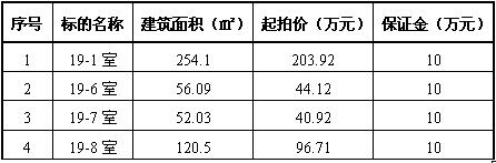 注:如上述房產在本次拍賣中全部成交,則在19層房產拍賣的買受人(包括19-2室、19-3室、19-5室的買受人)當中進行車位拍賣,車位拍賣的起拍價為24萬元/個,拍賣保證金5萬元/個,每套房產的買受人僅能成交一個車位。有意競得多個拍賣標的的競買人應當繳納足額的保證金。標的采用有保留價的增價拍賣方式,標的交易所發生的全部費用(包括房產買、賣雙方交易稅費及未知欠費)由買受人承擔。