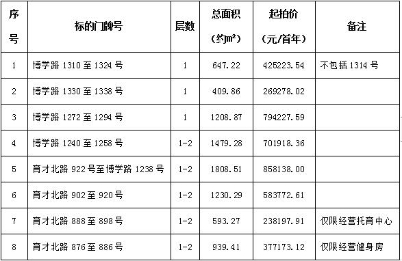 一、拍賣標的:杭州市蕭山區北干街道塘灣名苑沿街商鋪9年租賃權。商鋪位于杭州市蕭山區北干街道博學路、育才北路,總建筑面積約8316.71平方米,共分為8個標的。租賃期內免租期3個月,租金每3年遞增5%,首筆租金為三年一次性支付,第四年起租金一年一付,先付后用。履約保證金為成交價的一半(不計息)。具體清單詳見《拍賣文件》。