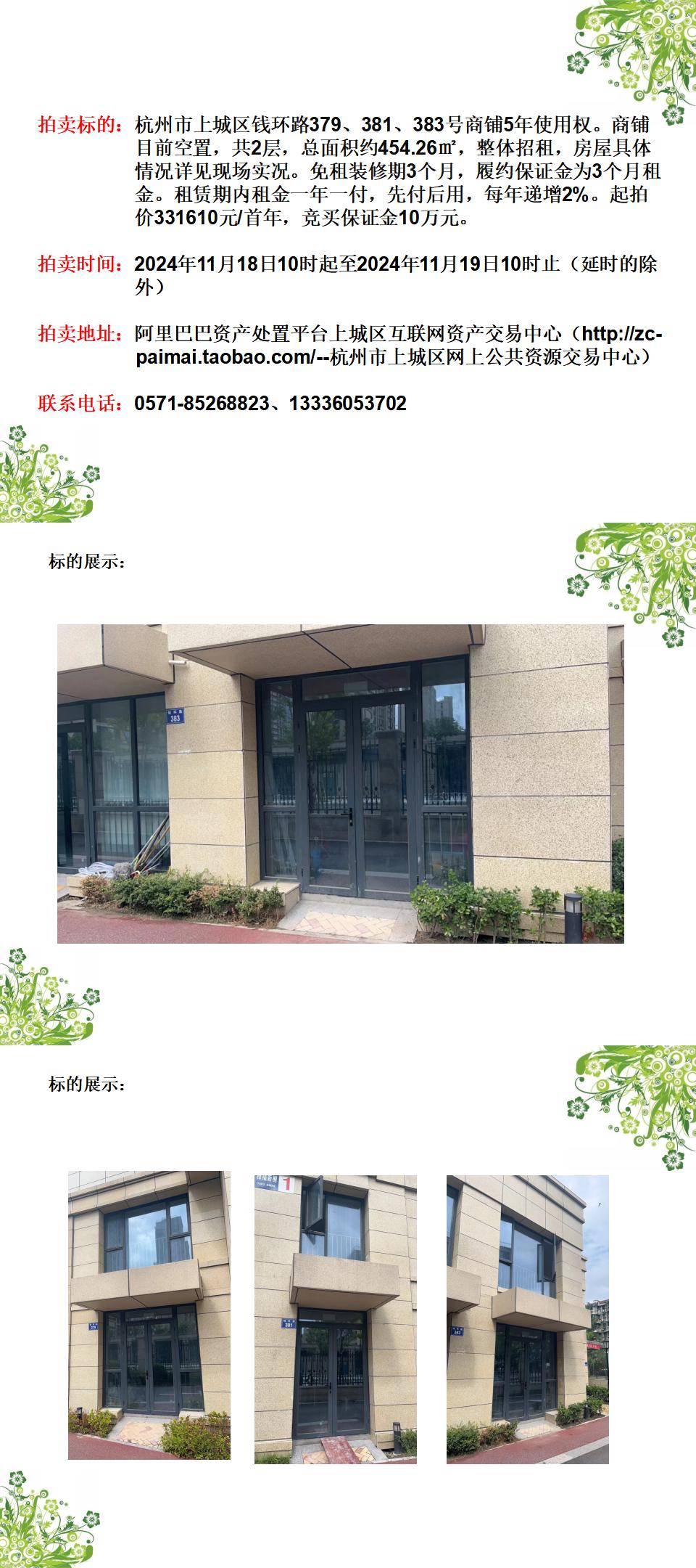 杭州市上城區(qū)錢環(huán)路379、381、383號(hào)商鋪5年使用權(quán)